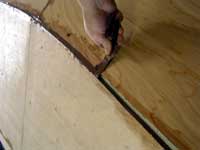 Once the first piece of the garboard plank was cut out, Jenny put a coat of thinned epoxy on the inside and Bonham spread thickened epoxy on the area that would contact the stringer. |