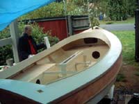 Bow-on shots on the trailer right before we started packing up. What you don't see is the insane effort to get all the spars (7 of them including bowsprit and boomkin) ready to go, packed, and wrapped. The centreboard and all the spars and about 40 lbs of hardware were loaded in and we wrapped her up in a nice tarp. Then Whoosh! Off mom went. The trip was successful and this little boat is now in Maine, safe and sound. Further progress shots of THIS boat will have to come from her. As for the other boat, I have taken a much-needed break, and will get back to work fairly soon. Current date is just under a year from the first pictures in the album. I expect to start work again after I return from a trip at the beginning of the month.