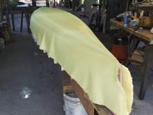 Took boat out in the yard and sanded hull. Cut out major voids and fit pieces of Kevlar felt in voids. Epoxy coated hull and covered Kevlar patches with 4 oz glass and peel ply.