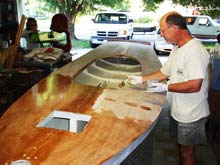 Out in the shop, molds are complete for a Hugh Horton "Bufflehead" sailing canoe, but I'm in "waiting to afford plywood" mode right now. So just painting and varnishing until then. Here is Bolger Nymph "What, Me Worry?" getting a facelift and a kickup rudder conversion. My first, and still favorite.