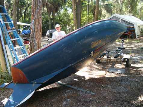 Laylah and I stopped by the museum to see what the guys were doing. They specialize on bringing life back to really old beat up boats, I guess you need to cause there aren't any new ones to look at. Laylah had a chat with Doug, you know him from his articles in the "Ash Breeze". Jim is finished with "Carpenter" so we took it out for a builders trial. It needs a little tuning but it should be fine. The weather for the messabout should be perfect. We're expecting to see at least ten sailboats and even more rowboats and kayaks. Wear your swim suits to play on the sand bar on the way to Mar Vista. Laylah's kindergarten class is building model boats for Columbus day so "Peepaw" helped her make one, she did do all of the decorating. This is Helen's sister, Norma Ann. She was with us for part of the trip west. This will really embarrass her but what are sister in laws for anyway? Howard's Texas Sled is getting bigger and bigger. Annie Holmes, the San Diego TSCA chapter mom has a little girl who's in Afghanistan with a State Dept. job to translate. I bet she's one tough cookie to be able to handle those guys. If you don't keep a close eye on them there's no telling where your kids will end up. Stan needed to work on his trailer so he lifted Yeehaw with a single line through the drain plug, a really good idea when you think about it. This is probably the strongest point on the hull.