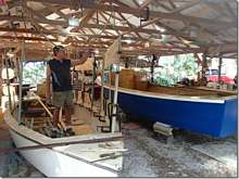 Everything ends up being "repurposed" if it comes here. This is an old Lightening sailboat hull that Wally's converting into a cabin motor boat, I jumped in to check the height of the sides. Notice that I've switched to the summer uniform. We all get really upset if anyone tries to give us any advice; and besides how the hell could you give advice on any of the strange boats taking shape here at the happy hour club. Only the builder has any idea of what it's suppose to turn into and that changes daily.