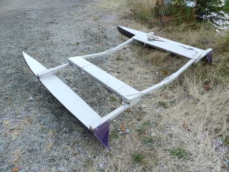The main hull is a sailing Duo and it is fitted with two Vee shaped outriggers that bolt onto the Duo wings. The wings are then lashed to the main hull gunwales, as they are on Duo, see below. The outriggers add masses of stability for little extra weight, especially as all the panels for the outriggers are made from one sheet of 3 or 4mm ply. So the whole boat is very light and cheap to build, basically made from just three sheets of plywood