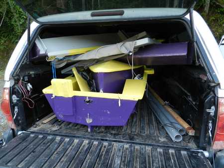 When sailing is over for the day the complete Tryst, including rig and outriggers can fit inside a pickup or van with a 6ft bed, (assuming a nesting Duo is built) as shown above. We have a three piece mast, the outriggers fit in diagonally.  In any event, once the three hulls are separated, it is easy to cartop - even singlehanded.