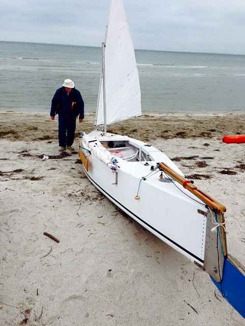 "I probably didn't get to the water for about 30 minutes; I was still tinkering with things," he said. In deference to the good breeze that was blowing at the start, and which soon increased to the predicted 15 to 20 knots from the northeast, John chose to start with just the 60-foot sail set in the middle of the boat. He had no problem sliding his boat to the water, and soon cleared the first hurdle that catches some boats, a shallow bar 40 or 50 feet off the beach.